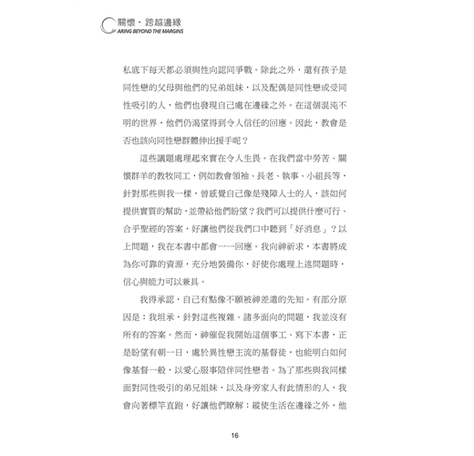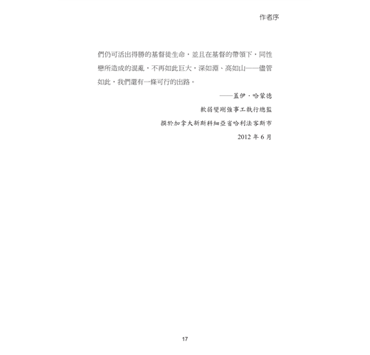 我得承認,自己有點像不願被神差遣的先知。有部分原因是:我坦承,針對這些複雜、諸多面向的問題,我並沒有所有的答案。然而,神催促我開始這個事工、寫下本書,正是盼望有朝一日,處於異性戀主流的基督徒,也能明白如何像基督一般,以愛心服事陪伴同性戀者。為了那些與我同樣面對同性吸引的弟兄姐妹,以及身旁家人有此情形的人,我會向著標竿直跑,好讓他們瞭解:縱使生活在邊緣之外,他們仍可活出得勝的基督徒生命,並且在基督的帶領下,同性戀所造成的混亂,不再如此巨大,深如淵、高如山──儘管如此,我們還有一條可行的出路。