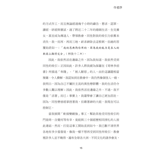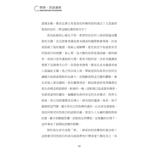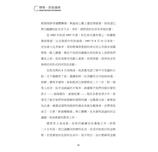 儘管有上述成就,但我仍繼續活在邊緣之外。即使二十五年前,我已遠離同性戀的生活,但受同性吸引的這根刺,仍真實地存在我的生命中。我不明白,為什麼神用這樣的方式作工,而且無論經過幾千小時的禱告、懇求、認罪、讀經、研經與嘗試,過了將近二十二年的婚姻生活、生兒養女,甚至成為傳道人、帶領教會,同性對我的吸引力依舊未消失。我一而再、再而三地,祈求神除去這根刺,但祂的答覆始終如一:「我的恩典夠你用的,因為我的能力是在人的軟弱上顯得完全」( 林後十二9 )。