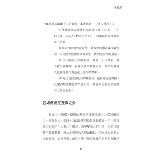 我曾經討厭自己會受同性吸引的事實,但現在不會討厭了。請注意,並不是說我已愛上了它;這事實或多或少仍是我生命中的重擔。假若有一天,主決定除去同性對我的吸引力,讓我成為位居主流的異性戀者,我當然不會與祂爭論。雖然這日子並未來到,但自從2006 年秋,在情感與生理層面都受同性吸引的我,靈命確實徹底翻轉。在此之前,我基督徒生命的前19 年裡,我必須承認,面對同性吸引與誘惑時,在我內心思想所造成的...