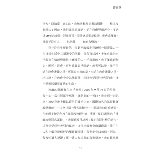 我並沒有生理缺陷,因此不敢假定我瞭解一個殘障人士在日常生活中必須遭受的困難,但我可以說,多年來我把自己視為在情感與靈性上癱瘓的人。千真萬確,我不僅感到無力、困惑、沮喪,更常感覺與世隔絕。或者可以說,我不但活在社會邊緣之外,更傷害自身的是,也活在教會邊緣之外。坦白說,在教會中身為基督徒,同時也受同性吸引的我,多半過著孤獨而疲憊的生命。後續的發展實在出乎意料:2006 年9 月19 日的早晨,我一如往常打開電子郵件,展開新的一天時,我收到一則訊息,迫使我走上難以置信的醫治之旅。國際知名的基督教護教學權威──道格拉斯.雅各比博士──邀請我前往華盛頓,在他所主辦的年度「國際教牧研討會」演講。我的講題是:「性解放與同志運動」。我頓時瞠目結舌:我把我同性戀的過往,以及仍受同性吸引的祕密,守得比國家金庫還嚴密。除了內人和少數我最信任的屬靈顧問外,我對此守口如瓶。因為,我害怕遭人拒絕:萬一讓人知道我的真實樣貌,我會難堪且羞愧至極。雅各比博士究竟是如何曉得我的過去?又是誰背叛我的信任,將這隱私傳到他耳中?