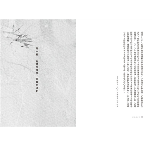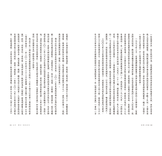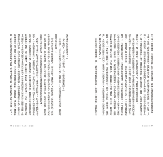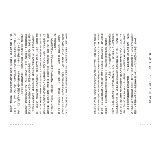 全書三十二篇穿梭在史實與虛構之間,單篇讀來是精采絕倫的短篇小說,貫串來看,是有助理解佛教發展脈絡與女性修行者史傳的重要文本。佛教傳入中國初期女子出家無門,因為授具足戒的儀式必須有多位比丘尼戒師,而中土的比丘都是男眾,四世紀的淨撿尼師和五世紀初的僧果尼師都面臨這種困境,她們如何正式受戒呢?古代女子在家庭與社會的抵制下出家不易,比如四世紀的明感尼師原是當家大夫人,歷經被綁去山寨十年驚心動魄的劫難,後以堅韌的心智向丈夫和家族爭取到出家。五世紀的曇暉尼師幼年已有愛慕她的未婚夫,她想方設法偷偷逃去寺院。清朝末年美人尼師了定,十七歲嫁入高門,後來拋開蒙受的不白之冤遁入空門。民國以降,從雲遊世界的清貧女畫家到創辦華梵大學的曉雲法師、剃度出家的大學校長隆迅法師、在巴西為佛教拓土開疆的覺誠法師等人,在在寫下璀璨動人的篇章。