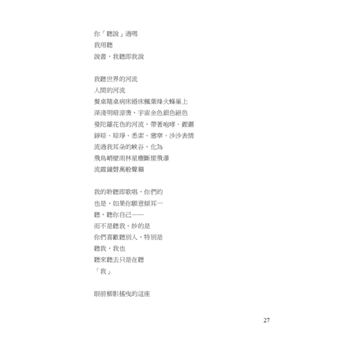 2011年11月,我參與策劃的「太平洋詩歌節」結束後次日,我右手、右背突然筋膜發炎,牽及腳傷、心憂、視衰、聲闇,至2013年3月這兩年多時間,不便使用電腦,無法肆意行動,困居家中,與疼痛共存。其間我長時間服用身心科醫師所開之藥,且在我太太幫助下,企圖藉寫作轉移身心之痛。2012年出版的詩集《妖/冶》,2013年出版的詩集《朝/聖》,即是這段時間被病魔磨練出,(偽)勇敢熬出的成果(或苦果?)。