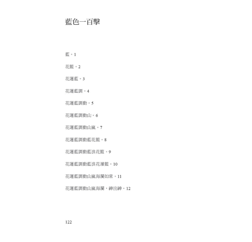 陳黎身為遊吟近五十年的花蓮詩人,在本書中「青青輕輕唱」他的花蓮藍調,「亂彈亂舞亂中有序」,企圖藉這「亂敲亂唱自成一團」的一人樂團,調合島嶼與歷史,夢與地理,彈奏出淡藍色的一百擊樂章。