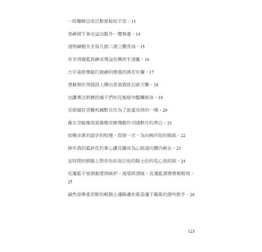 這本《淡藍色一百擊》是我第十五本詩集,收錄完成於2015年7月至2023年9月間短詩、長詩(或組詩)六十四首。2015年7月我寫成〈一百擊〉一詩,至2017年1月完成〈藍色一百擊〉一作時,心生以「藍色一百擊」為詩集名稱之念。到了今年(2023),決定改以「淡藍色一百擊」為我這本在《島/國》之後多年來詩作新集之名。2022年8月至10月間,我寫成以一百首「三行詩」組成的〈淡藍色一百擊〉。沒想到隨後,在10月底,我竟染了「帶狀皰疹」──在潛伏多日後,始發現左側額部與眉際冒出疹子,雖立即求醫服藥,一兩週後仍不幸...