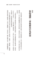 為了讓這些概念盡可能好懂,我們會以一個人的日常角度,來觀察他必須做的選擇。每章開頭都會有簡短的概要來詳述這個決策,接下來則會探討行為科學在這個思考流程背後的發現。