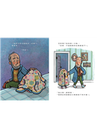 這片黑暗,不只是環境上的黑暗,也是心理上的。接著再看幾頁,就算不看文字,也能從祖孫的互動和表情,感受到他們懷著某種心事,他們走出屋外,過程並不容易,如同要走出內心那片幽暗那麼難;但他們走出去了,孩子依舊將自己緊緊包裹在拼布被底下,爺爺沒有勸阻,只是說:「放心啦,我會記得提醒自己棉被底下有什麼。」一路上,孩子漸漸露出小臉,探出頭,也打開心。大自然裡的生機和萬物不說道理,也不出聲安慰,卻療癒了他們,而這對祖孫,也療癒了彼此。