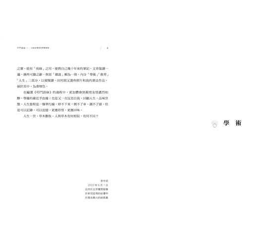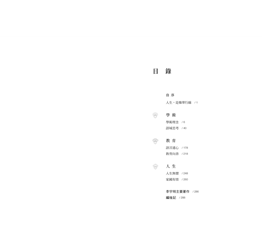 本書為著名語言學家李宇明先生在數十年學術生涯中的語錄摘輯,滿載作者對學術與人生的感悟思考。全書分為“學術”“教育”“人生”三部分,作者在“學術”中表達了他對語言學學術理念的思考以及對學界的現狀、前景、發展方向的看法;在“教育”中分享了對中國語言政策及語言人才培養等的反思;在“人生”中抒發了為人為學應有的態度與品行。全書並有選列相關照片及書法作品,插於其中,為書增色。