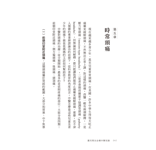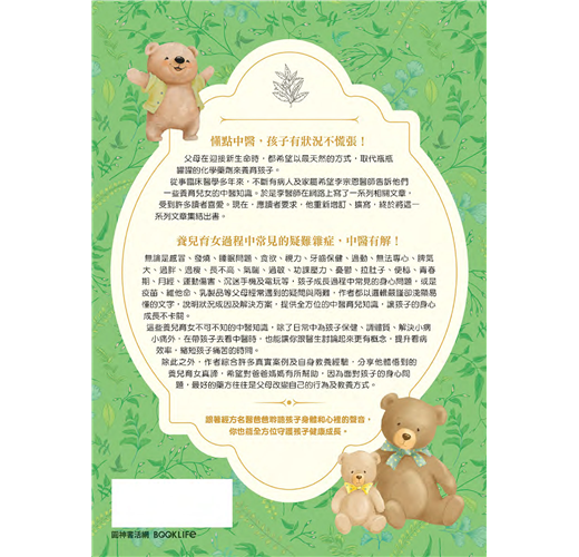 無論是感冒、發燒、睡眠問題、食欲、視力、牙齒保健、過動、無法專心、脾氣大、過胖、過瘦、長不高、氣喘、過敏、功課壓力、憂鬱、拉肚子、便秘、青春期、月經、運動傷害、沉迷手機及電玩等,孩子成長過程中常見的身心問題,或是疫苗、維他命、乳製品等父母經常遇到的疑問與兩難,作者都以邏輯嚴謹卻淺顯易懂的文字,說明狀況成因及解決方案,提供全方位的中醫育兒知識,讓孩子的身心成長不卡關。
