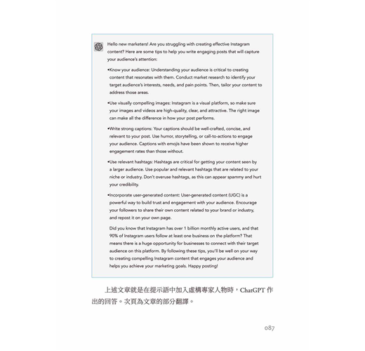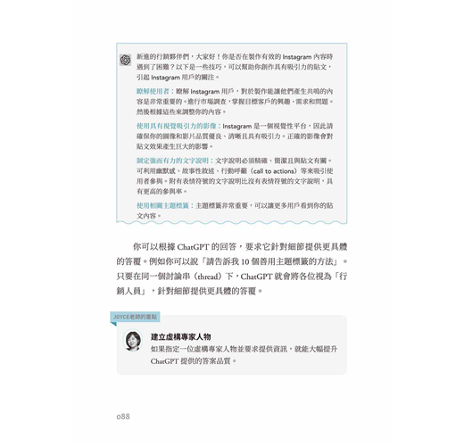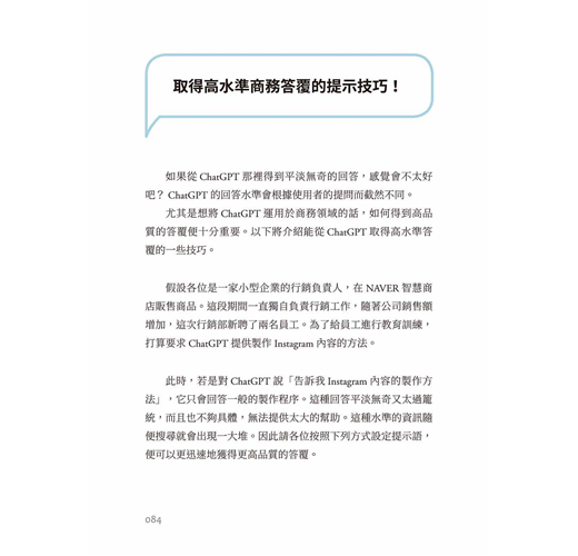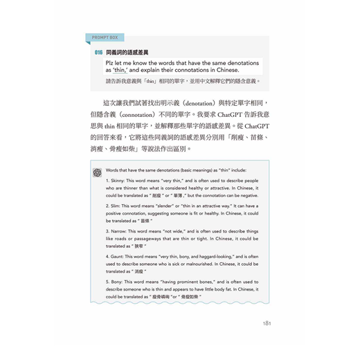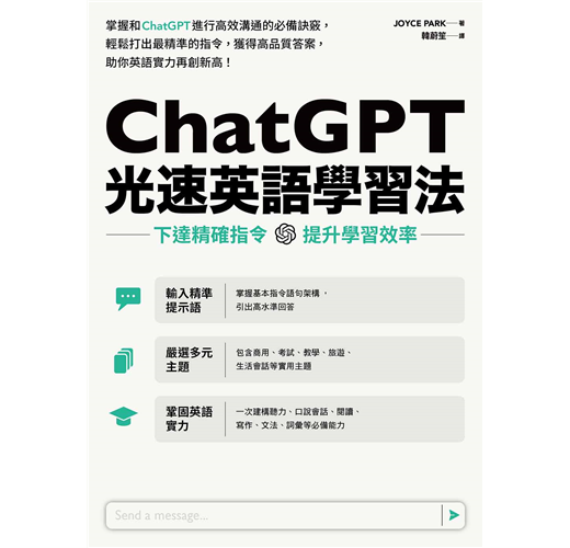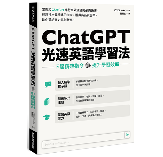 收錄經過多次測試、內容豐富的英文指令庫,讓你能直接應用,幾秒內得到答案。教你輸入提示語的技巧,並詳細解析運用語言學及教育專業術語的指令語句架構,讓你可依據個人需求隨意修改,寫出能得到ChatGPT高品質回答的精準指令。