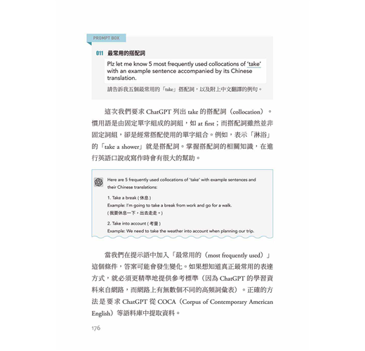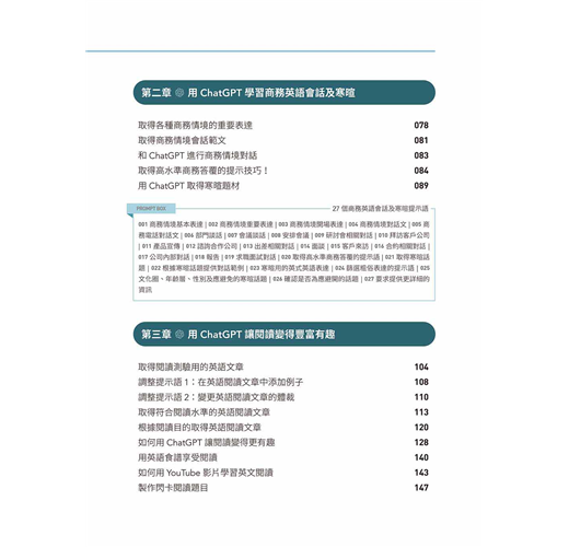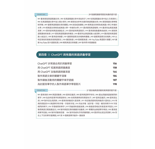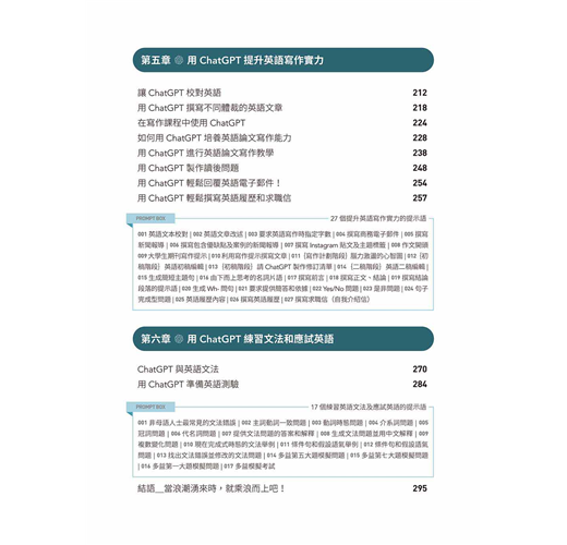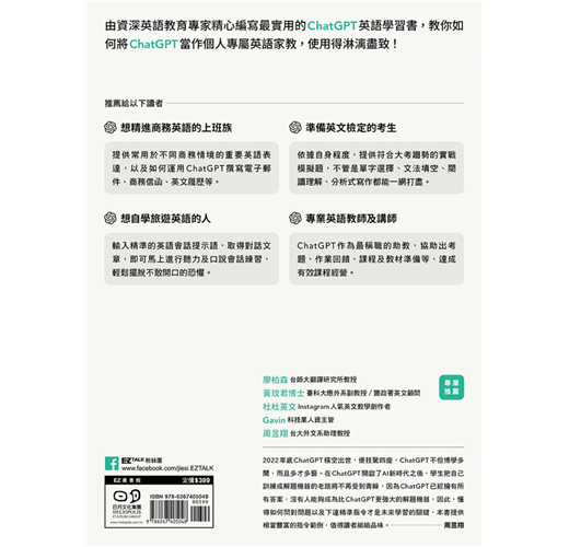 本書統整如何善用ChatGPT設計符合個人程度學習內容的方法。包含單字詞彙表製作、文法題型演練、閱讀文本翻譯、文章編寫及審校、考題設計等多樣化教材,