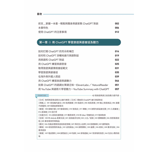 ● 針對海外旅遊及生活會話者:提供不同情境的會話範本,透過和ChatGPT對談來練習發音、語調、語速,讓你克服不敢開口的恐懼,累積口說實力及自信。