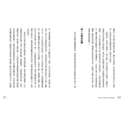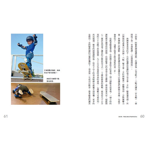 本書透過楊爸爸的視角,分享了楊小弟這四年來從自學滑板、找專業教練學習,到參加比賽的成長過程。看到楊小弟的純真,你會被逗得哈哈大笑;看到他摔倒痛得整個人捲曲起來,又會心生不捨;當他勇敢挑戰從五米高台衝下來和比賽時,讓你緊張得屏住氣息。