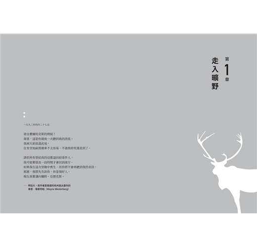 作者重返克里斯死亡之旅中踏過的路徑,甚至回到他的命喪之所;也一一探訪克里斯的家人、熟識,及與他萍水相逢的過客。為了拼湊出故事完整的圖像,作者更坦然寫下年輕時與克里斯相仿的心路歷程,並回顧另幾位走入曠野、一去不返的旅人。這使得本書超越了一般的報導文學,成為細膩動人的生命紀錄。