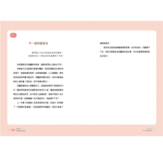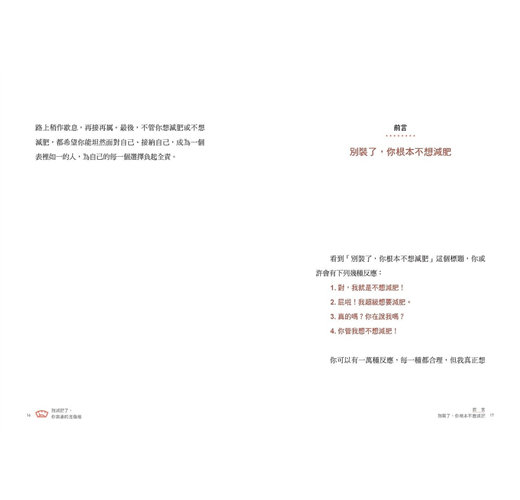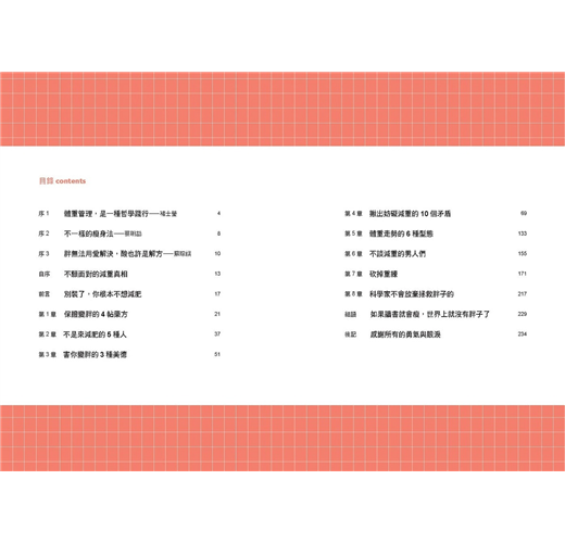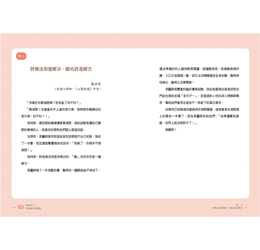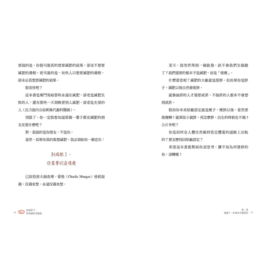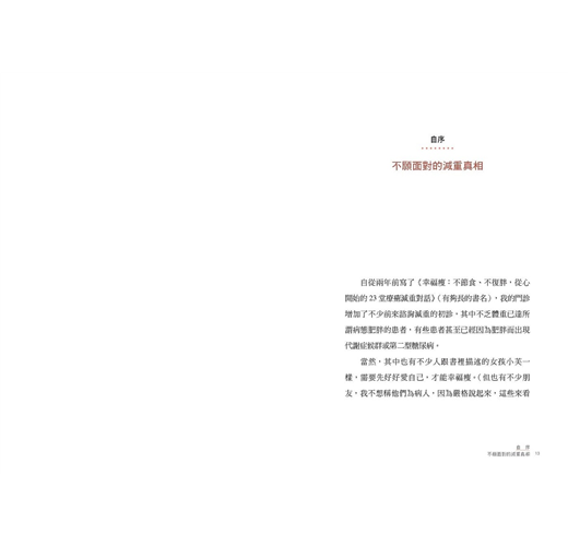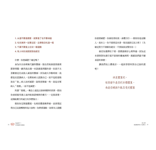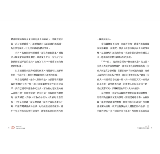 這段期間,我從每天臨床所觀察的故事歸納整理,用不同角度探索減重的議題。期望透過這本書,抽絲剝繭,顛覆你對減重的想像,撼動你原本的認知,找出體重卡關的盲點,就算沒有讓你從此擺脫肥胖的陰影,至少能夠會心一笑,知道你並不孤單,幫助你在減重的道路上稍作歇息,再接再厲。最後,不管你想減肥或不想減肥,都希望你能坦然面對自己、接納自己,成為一個表裡如一的人,為自己的每一個選擇負起全責。