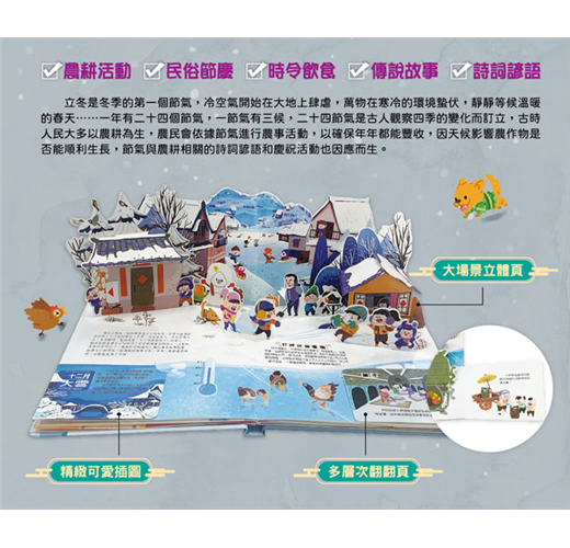 專為孩子設計的節氣百科繪本,結合立體、翻翻、推拉等多種互動小巧思,滿足孩子的好奇心,邊玩邊讀理解節氣對日常生活帶來的影響。