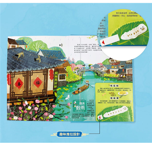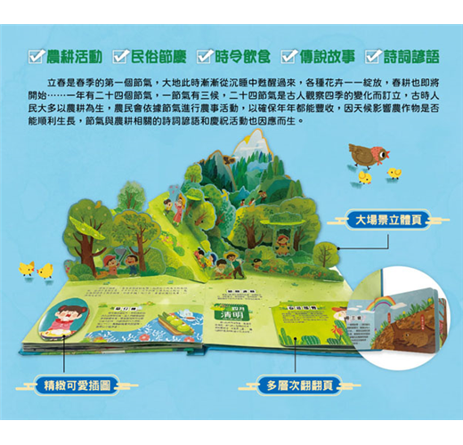 專為孩子設計的節氣百科繪本,結合立體、翻翻、推拉等多種互動小巧思,滿足孩子的好奇心,邊玩邊讀理解節氣對日常生活帶來的影響。