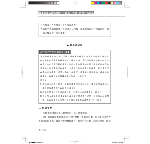 在2023年的年末,還算順利的將這本《鍾禾的憲法強迫取分:體系、爭點、解題一次搞定》出版了!那讓我們來說說這本書吧!為什麼不要延續之前的完全打擊書名呢?在《強迫取分》出版前就有跟出版社和編輯們討論過,希望這本書能夠只用「1冊」的方式完成,內容也可以包含體系、爭點和解題,幫助準備司律考試的同學「強迫取分」,用最少的時間換到最多的分數,追求台灣人最愛的CP值!