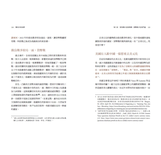 國際金融從1944 年布列敦森林金本位體系,演變到1973年至今的石油美元體系,遊戲規則都是以美國為經濟體系共主制定的,美元系統則成為制裁敵人的常用武器。但自2014年起的俄烏衝突,俄國面臨多國強力制裁仍能存活,加上中國推動人民幣計價交易及增加黃金儲備,顯示中俄與盟友們早開始建立強韌的經濟防線,為「貨幣戰」做準備。