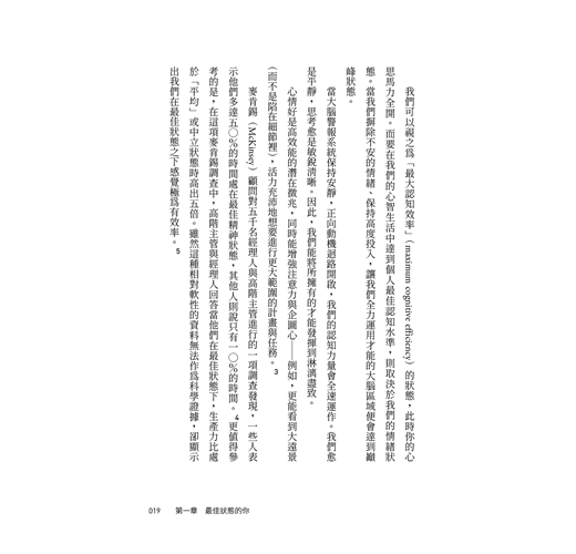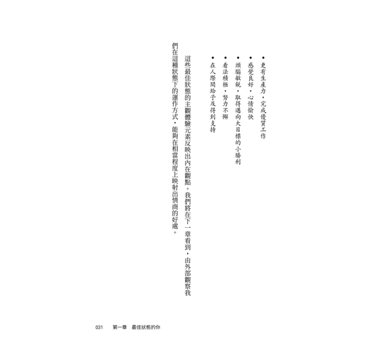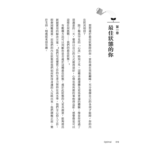 想想處於最佳狀態時的你。當你處在效能巓峰,充分發揮自己的各項才能時,你的內在狀況如何? 除了極為罕見的「心流」時刻之外,這種卓越還擴及更為普遍的體驗,像是你度過了很滿意的一天,覺得以自己的方式做得很好,心情也和所做的事相得益彰,感覺像是可以迎接任何挑戰──我們的最佳狀態。 有數種方法可以判斷你是否處於這種最佳狀態。處於此狀態的人更具創意,能夠提出新穎實用的解決方案。他們完成優質工作的生產力保持在高水準。他們全心投入工作,即便困難重重。而他們的內在狀態從他們如何對待身邊的人反映出來:他們積極正...