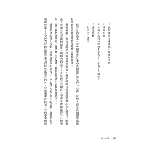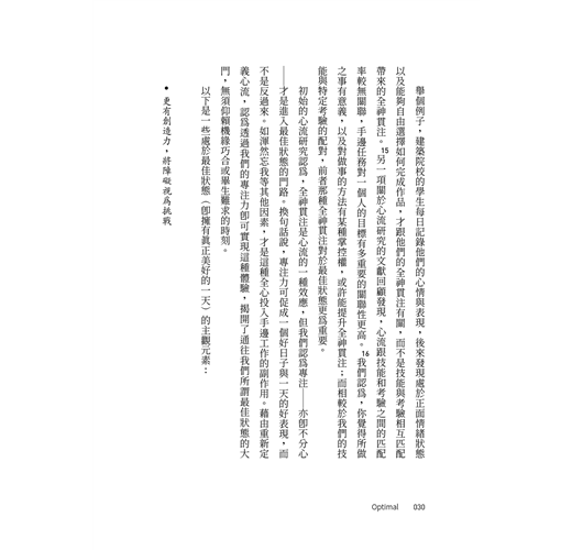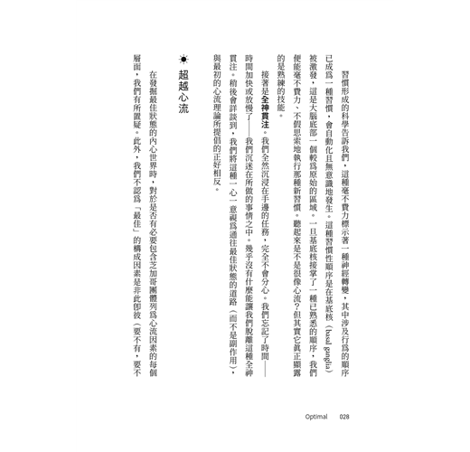 「如果能在『最佳狀態』之下進行各種活動,不僅生產力大幅提高,我們也可從中獲得快樂愉悅的滿足感,可說是最佳的時間運用方式。我常鼓勵人們進入『心流』狀態進行工作或學習,但若您總是心流短暫或力有未逮,那麼一定要試試此書所指導的方法,您一定可以做到『最佳狀態』!」