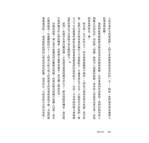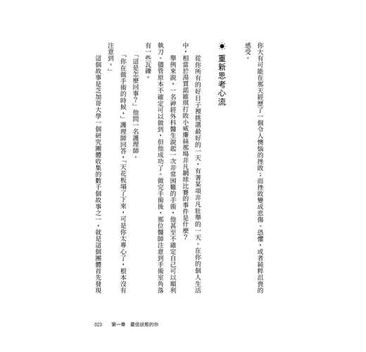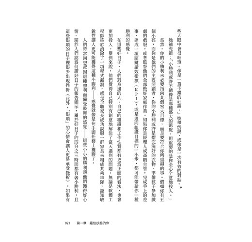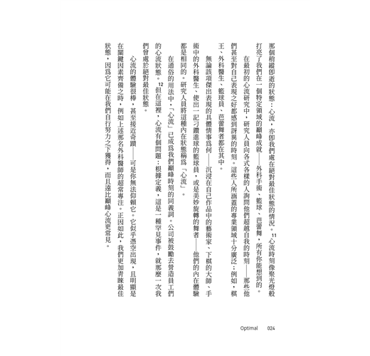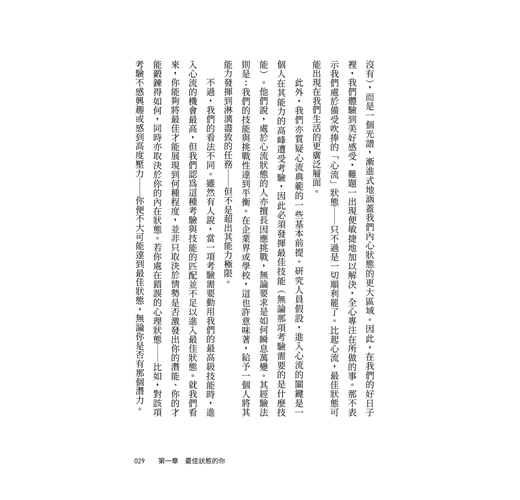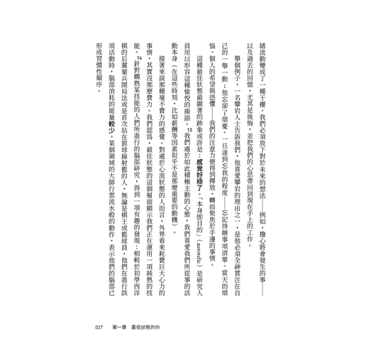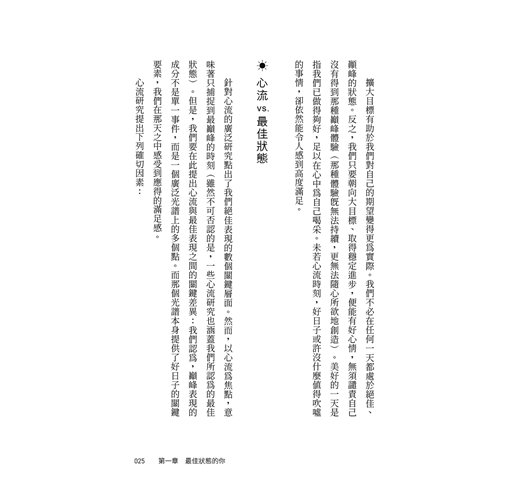 「本書從不同的人生切面分享了兩位作者的研究,生活的、情感的、工作的,我欲罷不能地讀著。若你尚未接觸過兩位大師的著作,本書不僅集大成,而且深入淺出,就請你只取這一瓢飲吧!你將能重新體會你內心的『最佳狀態』。」