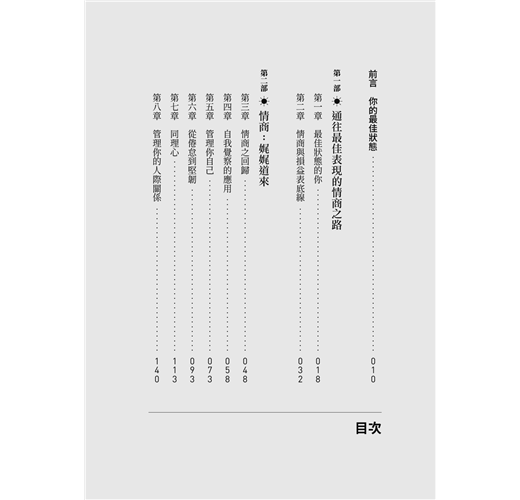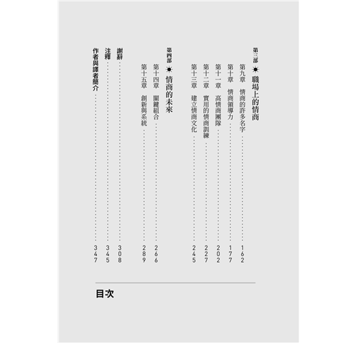 前言 你的最佳狀態 第一部 通往最佳表現的情商之路 第一章 最佳狀態的你 第二章 情商與損益表底線 第二部 情商:娓娓道來 第三章 情商之回歸 第四章 自我覺察的應用 第五章 管理你自己 第六章 從倦怠到堅韌 第七章 同理心 第八章 管理你的人際關係 第三部 職場上的情商 第九章 情商的許多名字 第十章 情商領導力 第十一章 高情商團隊 第十二章 實用的情商訓練 第十三章 建立情商文化 第四部 情商的未來 第十四章 關鍵組合 第十五章 創新與系統 謝辭 注釋