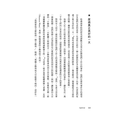想想處於最佳狀態時的你。當你處在效能巓峰,充分發揮自己的各項才能時,你的內在狀況如何? 除了極為罕見的「心流」時刻之外,這種卓越還擴及更為普遍的體驗,像是你度過了很滿意的一天,覺得以自己的方式做得很好,心情也和所做的事相得益彰,感覺像是可以迎接任何挑戰──我們的最佳狀態。 有數種方法可以判斷你是否處於這種最佳狀態。處於此狀態的人更具創意,能夠提出新穎實用的解決方案。他們完成優質工作的生產力保持在高水準。他們全心投入工作,即便困難重重。而他們的內在狀態從他們如何對待身邊的人反映出來:他們積極正面、樂於支持、相處起來很有趣。 我們可以視之為「最大認知效率」(maximum cognitive efficiency)的狀態,此時你的心思馬力全開。而要在我們的心智生活中達到個人最佳認知水準,則取決於我們的情緒狀態。當我們摒除不安的情緒、保持高度投入,讓我們全力運用才能的大腦區域便會達到巓峰狀態。 當大腦警報系統保持安靜,正向動機迴路開啟,我們的認知力量會全速運作。我們愈是平靜,思考愈是敏銳淸晰。因此,我們能將所擁有的才能發揮到淋漓盡致。 心情好是高效能的潛在徵兆,同時能增強注意力與企圖心──例如,更能看到大遠景(而不是陷在細節裡),活力充沛地想要進行更大範圍的計畫與任務。 麥肯錫(McKinsey)顧問對五千名經理人與高階主管進行的一項調查發現,一些人表示他們多達五○%的時間處在最佳精神狀態,其他人則說只有一○%的時間。更値得參考的是,在這項麥肯錫調查中,高階主管與經理人回答當他們在最佳狀態下,生產力比處於「平均」或中立狀態時高出五倍。雖然這種相對軟性的資料無法作為科學證據,卻顯示出我們在最佳狀態之下感覺極為有效率。 ▌度過真正美好的一天 哈佛商學院的研究員請數百名男女記錄他們工作日的事件、他們在那些事件中的感受以及他們完成的成果,在這些日誌中,個人經歷的許多具體要素浮現了出來,代表他們度過了眞正美好的一天。那些成果都是認知效能的跡象──像是解決一個電腦程式方面的棘手問題、構想出新的實用廚房器具,或是管理工具的製造與銷售等心智挑戰。 每個人在工作日結束時會塡寫一份問卷,回頭審視剛剛過去的事件──總計有近一萬二千份人們內心世界的敍述。這個資料寶庫揭示出那些高度滿意的日子的要素。 對所有人而言,最佳狀態對於他們工作上的表現都極有幫助。當然,生產力沒有單一測量指標;我們每個人必須依照自己重視的結果找到自己的指標,例如,讓你邁向大目標的「小勝利」。以軟體工程師而言,小勝利意味著找到方法去複製一些舊程式碼,將一項團體軟體計畫的所需時間縮減數個小時。又或者,就非盈利組織創辦人香儂.瓦茲(Shannon Watts)來說,對她重要的小勝利如下所述。 「我想要每天都取得一個小勝利,」她說。「那種小勝利每天可能都不相同,或許在一些人眼中會很細瑣。像是一篇不錯的社論,」她舉例說,或像是一次有效的對話。 她補充道:「小勝利或許不總像是那種盛大的凱旋,但重要的是你全心全意地投入。」當然,你的小勝利未必要指向某個宏大目標,而是要符合你所重視的事。假如你有五個小孩,而你是他們的主要照顧者,你的小勝利或許是摺完洗好的衣物、準備孩子參加戲劇的戲服,或者監督他們全部做好家庭作業。如果你是經理人或高階主管,完成手上的差事、達成一項關鍵績效指標(KPI),或是邁向組織目標的一小步,都可能帶給你一種勝利的感覺。 在這些好日子,人們對身邊的人、自己的組織和工作性質都有更為正面的看法,也會更加投入。舉例來說,他們覺得自己特別有創意地解決了當天遇到的問題。無論是軟體工程師終於消除了一項程式漏洞,或是全職家長成功說服一群家長來組成共乘車隊,認知敏銳性讓人更可能獲得這種小勝利──感覺就像是在手頭任務上獲勝了。 人們時常回想起因這種勝利而備受鼓舞的感覺──這些小小的勝利讓他們獲得好心情。關於人們認為何謂好日子的報告顯示,屬於好日子的四分之三時間都有著小勝利,且這些很順的日子裡很少出現挫折(此外,「很順」的心情會讓人更易承受挫折)。如果有人或有事件支持著他們,人們尤其會覺得那是美好的一天──例如,他們感受到身邊他人的尊重與鼓勵。 當我們能夠輕鬆解決眼前迎來的問題與挑戰,自然會感到更加愉快;我們的感知染上積極正向的色彩,因此將「問題」視為令人振奮的挑戰,身旁的人看起來也更友善,而他們看我們時也一樣。 相反地,在不好的日子,所有事情都顯得不順利,人們表示感到沮喪及焦慮,甚至悲傷。他們完成任務所需仰賴的人不那麼配合,手邊資源也不充足。大腦研究告訴我們,壓力之下分泌超量的神經化學物質會重創我們的認知能力──比如,不受控制的壓力會破壞我們的專注力及抑制不當反應的能力。 當然,此處存在著回饋迴圈。正面感受會增強擁有好日子、解決問題的機率,進而提升我們擁有好心情的機會。成就感不僅帶來滿足,甚至讓人興高采烈。 同樣的道理,壞心情可能讓我們更難解決問題,而無法解決問題可能讓人沮喪,甚至自憐與厭惡。在最糟糕的日子,人們表示缺乏他人的情感支持或事情進展不順,令他們感覺處處受阻──兩者都對他們的心情造成毒性影響。如果你在一天結束時失