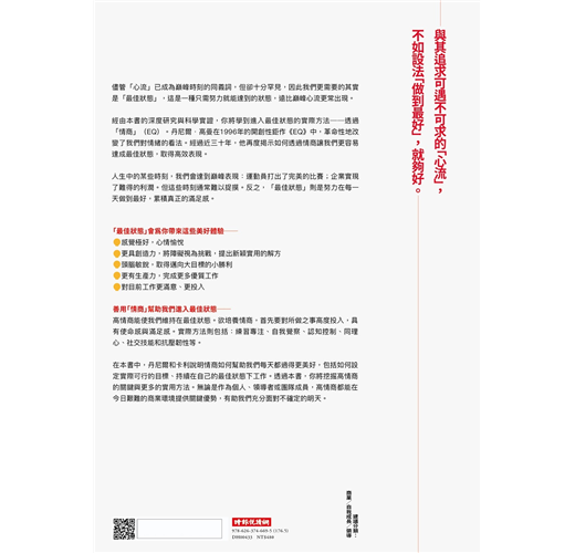 前言 你的最佳狀態 想像一下,如果你是二○二二年美國網球公開賽第四輪的艾拉.湯賈諾維琪(AjlaTomljanovi),你會有什麼感受。湯賈諾維琪在小威廉絲(Serena Williams)的生涯最後一 場賽事擊敗了她。小威廉絲是網壇傳奇:二十三度獲得大滿貫,那一天出賽時正値她的巓峰。此外,有二萬四千名球迷擠滿了這座全球最大的網球賽場地,顯然都支持她這邊。 幾乎所有球迷都在「高喊著小威贏球」,外加線上觀賽的數百萬人。想像現場的「各種嘈雜聲,包括為小威助陣的吼叫、湯賈諾維琪發球失敗時無禮的歡呼、看台上的各界名流、對小威致敬的影片。」 不過,湯賈諾維琪有一項祕密武器。她的父親是前職業手球冠軍,也是她的第一位教練,教她利用專注來鎭定神經。「他曾給她看電影《往日柔情》裡,凱文.科斯納飾演的投手在一場完全比賽是怎麼做的。他全神貫注在捕手的手套上,忽略球場裡其他一切事情。」湯賈諾維琪聽從父親的指導,徹底保持專注。 她在賽後表示:「從我踏上球場的那一刻起,就不再四處張望。我完全封閉在自己的小泡泡裡。」湯賈諾維琪的這種專注維持了三個多小時,打出個人生涯最佳比賽,在三局裡擊敗了小威廉絲。 她在這場了不起的網球賽中體現了「心流」(flow),亦即全心浸淫的狀態、讓人們發揮出終極巓峰表現。這種超凡專注能讓每個人做到最好,稍後我們將詳細探討。而你的情緒狀態也至關重要,因為不安的想法會讓人無法全神貫注,所以世界級運動員才會那麼重視「心理比賽」:他們是在跟這項運動的最頂級運動員競爭。因此,他們的內在狀態與專注成為勝利的關鍵。 不過,由於「心流」通常用來表達我們人生中罕見、甚至難以捉摸的事件,所以我們更偏好較為實際、可實現的目標:對於自己度過了美好的一天感到滿足,按照你自己設定的標準,這一天是有成果的。這就是我們所說的「最佳」(optimal)。 我們認為,僅是聚焦於湯賈諾維琪這一類的超凡成就,便忽略了我們每個人都可以進入的、讓我們發揮到最好的最佳狀態之線索與條件──尤其是她那鷹隼般的專注。 我們認為,堅守在我們的最高水準──以我們個人來說相當於湯賈諾維琪的完美網球表現的東西──容易讓我們傾向完美主義,造成精疲力竭與倦怠。我們不可能時時刻刻都維持在巓峰,但我們可以一直設法做到最好。無止境地追求心流會讓我們走向極端,而做到最好則是更為現實的目標。 我們的最佳狀態模型之於好好表現的概念,就像是帶小孩那樣,我們不必每時每刻都當個完美父母,而是盡量做好分內的工作。追求心流的理想將我們架在一個太高的標準,架在「最好的我們」的完美主義式觀點,而最佳標準能讓我們放鬆、享受自己正在做的事,不會一直批評自己。請你腦袋裡的批判聲音閉嘴,專注在手邊的工作就好。 在本書第一部,我們將描繪最佳狀態是什麼感覺,所依據的是數百人記錄自己美好一天的內心架構的日誌。接著,我們將透過卓越職場表現的觀點,探討那種內心架構從外部看來是什麼樣子。 我們兩人都是心理學家,因此尋求紮實的研究發現來導引我們的思路。依循著研究,我們發現最佳狀態的一個關鍵因素在於情緒上的智慧──換言之,就是情商(emotionalintelligence,俗稱EQ)。 觀察來自外部的職場卓越指標如何反映出人們自己回報的內在體驗,對我們而言是一種頓悟,讓我們看見情商是通往個人卓越表現的大門。我們的結論是,最佳表現的關鍵要素取決於情商,儘管情商的能力近年來被冠上了各式各樣的名稱。 我們分析了數十年來有關情商的科學發現,其中顯示情商對最佳狀態──以及造成我們無法達到那個狀態的原因──有著直接影響。比起心流之下的神奇巓峰體驗,擁有滿意的一天才是成就與自我實現的關鍵,更別提還能避免身心倦怠。 我們認為,情商可以在各種方面提供我們每個人內在資源,讓我們更能達成自己的最佳狀態。在本書中,你將找到更容易進入最佳狀態的實用方法,而不必等待一些難以捉摸的因素將你帶入心流時刻。 ▌為什麼是現在寫作本書? 對丹尼爾來說,本書是他將近三十年前靈光乍現的積累與確認:情商提供了一份地圖,以指引我們達到最佳狀態。這是他有關情商主題的第五本著作,書中匯集了可證實他當初的直覺的大量研究。 這個主題的第一篇學術論文在一九九○年面世,數年之後,卡利和丹尼爾共同創辦了「組織 EQ研究協會」(Consortium for Research on Emotional Intelligence in Organizations,簡稱CREIO),並擔任該協會的聯合主席長達二十五年。該協會的使命是:鼓勵將學術方法標準與營運組織實際需求予以整合的健全研究。 這個協會的宗旨,是將那些在企業與學校等組織試驗情商應用的從業人士,以及可以將他們的方法論應用到這些專案的學術研究人員聚集起來。 現在,過了四分之一個世紀,此類研究已經族繁不及備載。雖然在這個概念出現的早年,有些批評者(理由正當地)指謫沒有足夠證據支持情商攸關工作績效或領袖能力,而今關於情商對各種效能(effectiveness)的重要性,已有充分的論據,尤其是當自我管理和同理心、社交技能或抗壓韌性具有重要影響的時候,而這種時候太常見了。 就讓我們一起來收獲這豐盛的研究成果。在本書第一部,我們將探討當我們表現出色時是什麼因素正在起作用,以及情商能如何幫助我們達成此種狀態。 在第二