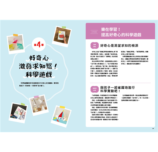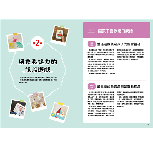 2. 嚴選50種啟發遊戲:藉由日本兒童教育專家從Instagram 上20萬款適合兒童發展的遊戲中,收錄50款媽媽們最希望孩子能培養的能力、且在家就可輕鬆實施的遊戲進行分類。