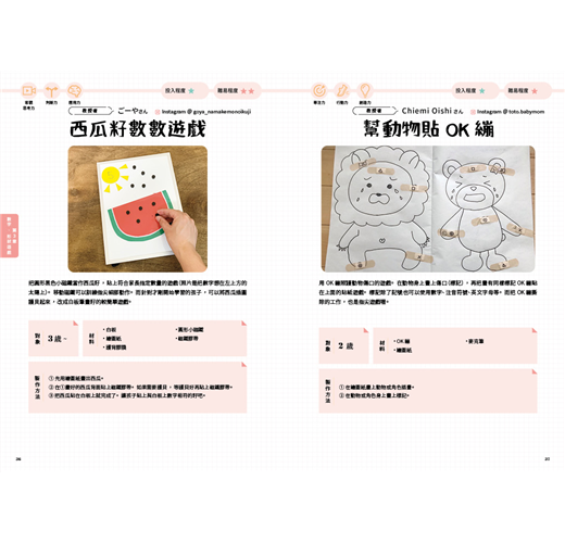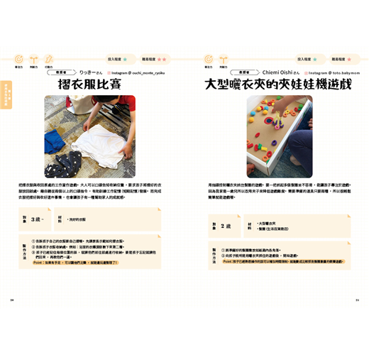7. 不同領域的作者共同設計:本書作者背景包含職能治療師、教保員及玩具設計師,並由日本知名兒童全方位教育副教授共同擬定。作者的多元背景確保內容的綜合性及專業性,讓每款遊戲都有助於孩子全面發展。