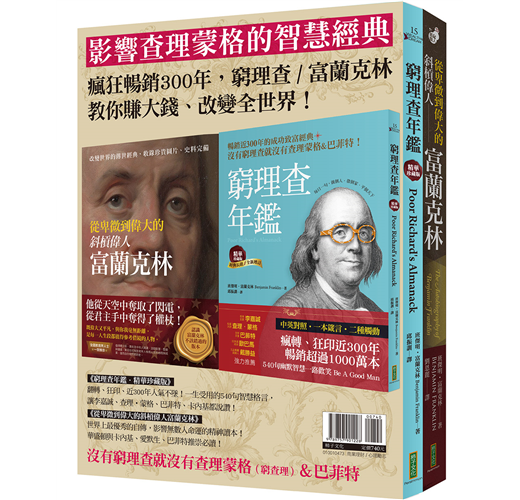 股神巴菲特的50年智慧盟友──查理•蒙格說:「富蘭克林的格言比商學院學到的東西有益得多。」事實上,不只查理•蒙格奉富蘭克林為人生導師,華倫•巴菲特也深受其影響,他的推薦書單就有《窮理查年鑑》;連世稱「巴菲特最忠實信徒」的印度投資高手莫尼斯•帕伯萊也認為,《窮理查年鑑》裡的〈財富之路〉是投資理財必讀的經典!