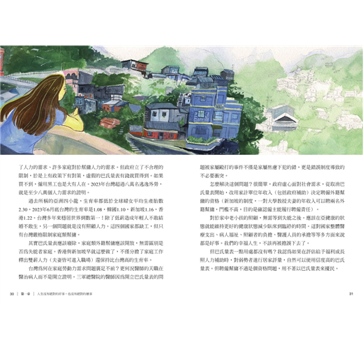 「安養與照護」是世界性的議題。「安養與照護」不單是一種福利政策,也隱藏著倫理與龐大商機。「生老病死」是人生常態,也導出公共事務的教育(生)、安養(老)、照護(病)以及殯葬(死)四大面向。實際執行時則有「人、事、物」三個變數。「人」方面,甚麼樣的人需要照護、甚麼樣的人提供照護、甚麼樣的人實際執行照護(需要甚麼資格);「事」方面,要如何照護、與醫護如何協調合作、照護工作的型態等;「物」方面,照護的設備、財力支持等。「人事物」的種種歸結就在分配與制度的問題上。而在這些變數存在的基本上有一個時間軸,「人事物」便在這個時間軸上滾動變化。有許多事務以前不可用的現在開放了,有許多已經執行的因為時間軸的滾動而必須修改現在則仍抱殘守缺等等。政府對於三種變數在時間軸上的變化對應得並不敏銳,因此才會有不合時宜的法令存在。比方說外籍看護工的聘僱(「人」的問題),巴氏量表(「事」的問題),長照經費的補助(「物」的問題)等,這些種種僵化會讓身為當事人深深有感,因此,姮燕與童律師寫出來與大眾分享並呼籲政府與時俱進,能隨時改善與時間軸的滾動同步。