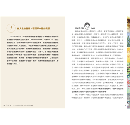 Heidi在書中描繪家庭成員,父母親特質及之後生病需要照顧的情境,這些都能引起許多人的共鳴。而共鳴之餘,如何解決需要照顧的人力則提供非常具體的情境及解決方案。這本書還有著許多不同的案例,每個都是活生生在台灣發生的狀況,案例跨各式各樣的慢性疾病照顧,例如:癌症、失智、身心障礙、幼兒照顧、緊急需求照護等等。Heidi與童律師二位作者將案例與照護及法律觀點相結合,並提出許多照護人力、照護系統上的看法及政府與法律的角色等,讓閱讀的人清楚瞭解實務面與政策面的做法及落差,同時也提供政府政策的參考。