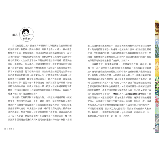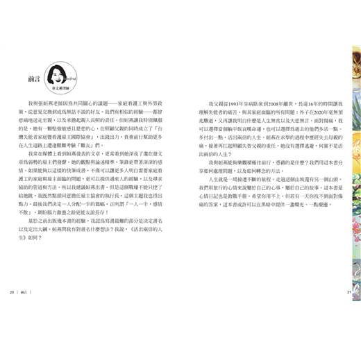 因緣際會下,與童律師認識,一起討論外勞政策。就這樣,我們一南一北,竟然也可以聊出亦師亦友的情誼,而每每跟童律師討論,總可以獲得知識的增長與人生的啟發,也看到法律人嚴謹的論述下,有著對人事物的悲憫。今年農曆年後的某一天,童律建議寫下我們照護以及送走家人的故事,甚至似乎不假思索地連書名都想妥,就叫《活出兩倍的人生》。當下我會心一笑,想著「妳怎麼知道我每天念著把我母親的那部分也繼續活著」,但同時思量著一個藏著這麼深的思念跟情感,真要挖出來寫給大家看嗎?所以不死心地又確認了兩次,真的要寫嗎?畢竟,「堅強的人,只是把悲傷藏的比較深」,要把悲傷挖出來,還是埋更深?但念在童律師跟我,應該都不是逃避現實的人,而且都有「路見不平拔刀相助」的特質。所以這一次,透過書寫自己人生旅程中的照護故事跟感觸,在活出兩倍人生的過程中,可以把照顧至親、面對死亡的心路歷程,帶出正面的意義與大家分享。我相信,一切都有最好的安排,包括這本書。此書獻給每一位,勇敢面對人生旅程中生、老、病、死、苦的人。
