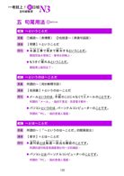 本單元挑選出N3必考的近八十個句型,並分類為「接尾語・複合語」、「副助詞」、「複合助詞」、「接續用法」、「句尾用法」、「形式名詞」等六大類。每個句型皆附有中文意思、規則以及二例句,讓您融會貫通,文法清楚不混淆!