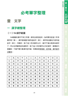 按照考試內容,本書分為四大單元,每一單元一開始分別是「單字整理」、「文法分析」、「閱讀解析」、「題型整理」,接著每一單元都有實力測驗與解答解析,除了一網打盡所有必考重點之外,還能藉由測驗與解析找出應考盲點,厚植實力。