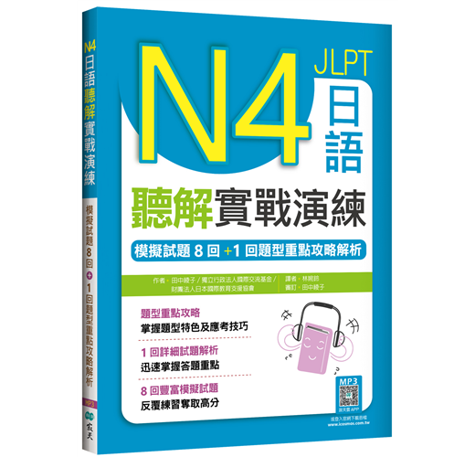 ▶題型重點攻略:以試題型式、題型特色及解題技巧三個角度,澈底分析N4聽解「課題理解、要點理解、發話表現及即時應答」。透過深入的試題分析,完全掌握考題型態、應考要點,事半功倍。