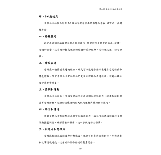 音樂元素的教導對於3-6歲幼兒有著重要的影響和意義,關鍵方面為:聆聽技巧、情感表達、協調和運動、語言和溝通、創造力和想像力、學習和記憶、美語學習。