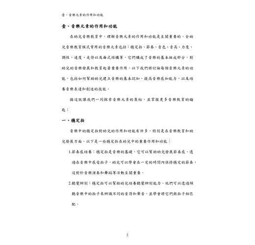 1.節奏感培養:節奏是音樂的基礎,幫助幼兒發展節奏感。透過聆聽和感受音樂中的節奏,幼兒能夠學會在一定時間內保持穩定的節奏,尤其是固定的節奏型,有助於幼兒理解與記憶。