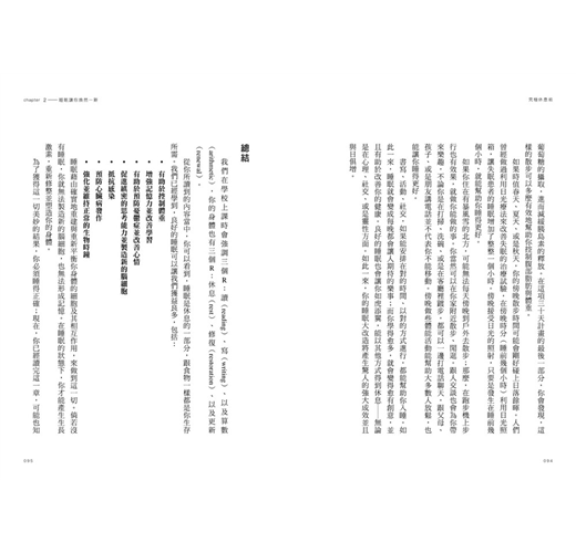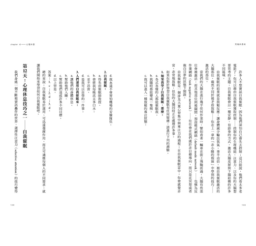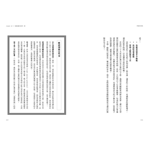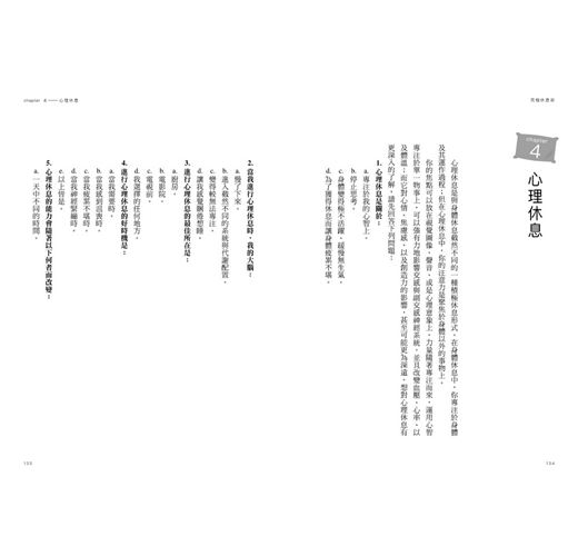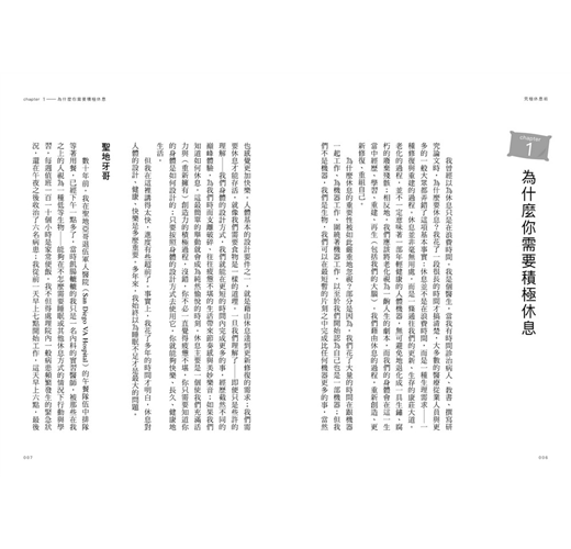.除了提出改善睡眠品質的方法,並詳盡介紹四大「積極休息」領域:身體休息,心理休息,社交休息,靈性休息,以及家務與工作繁忙之時的快速休息法。