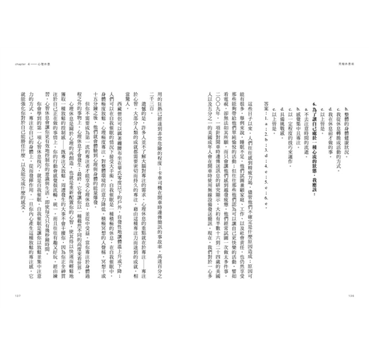 .於第一部內容中提出30天重新設定身心的休息計畫。每天介紹一項強而有力的休息技巧,大多可以在數分鐘內完成!