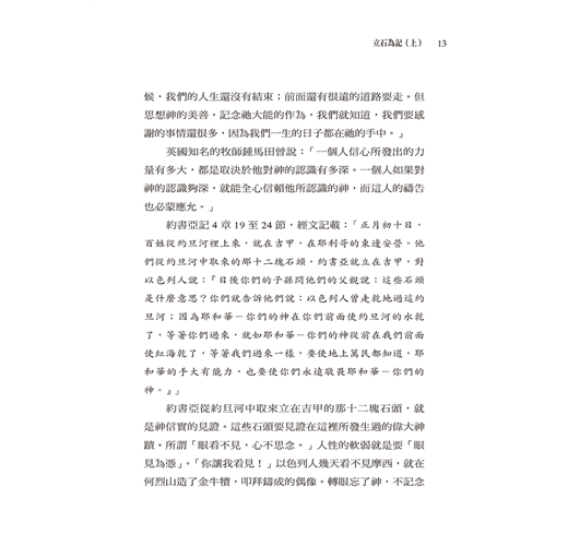 神了解人性,祂吩咐約書亞要「立石為記」。他們立了十二塊石頭,是按著以色列人十二支派的數目。神要約書亞記錄人生的重要時刻,神曾經怎樣向他們施恩,好叫他們察覺他們原是一直在神信實的帶領之下。