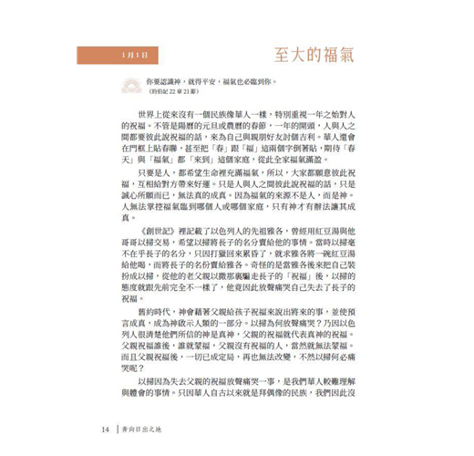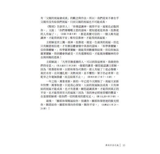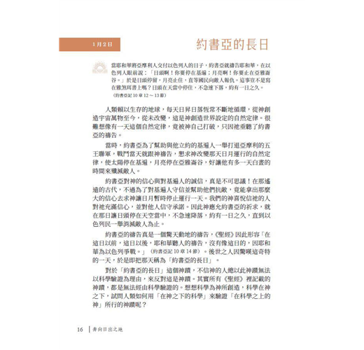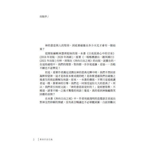 很開心慧瑛姊妹能夠繼《日夜流淌心中的甘泉》一書後,再一次以同樣的方式為主獻上《奔向日出之地》這本佳作。此書的問世,乃是疫情之後,神賞賜給我們的最佳禮物與最溫馨的提醒。書裡的366篇靈糧,就像一位屬靈的好友,每日藉著一個主題與章節,陪伴我們向著真光邁進一小步。如果我們能夠每天閱讀它,直至年終,必然發現自己正在奔向神,奔向屬靈的日出之地,與主更近。