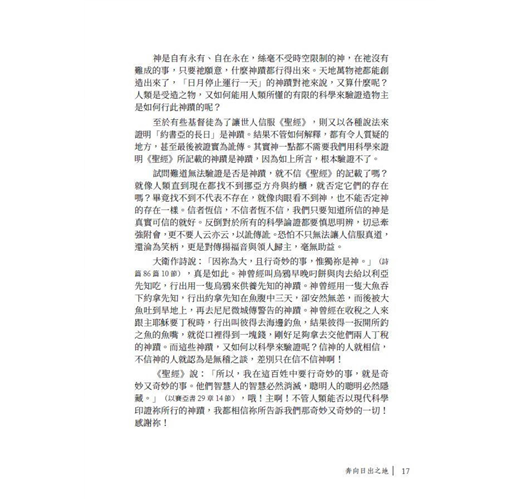 所謂日出之地,即是太陽出現的地方,只要我們面向日出,便會被光照耀。《聖經》說:「神就是光,在祂毫無黑暗。」(約翰一書1章5節),我們只有奔向神,才能被真光照耀,也才能把心中的黑暗驅走,因為在祂毫無黑暗,也才能讓自己永遠活在光明中。