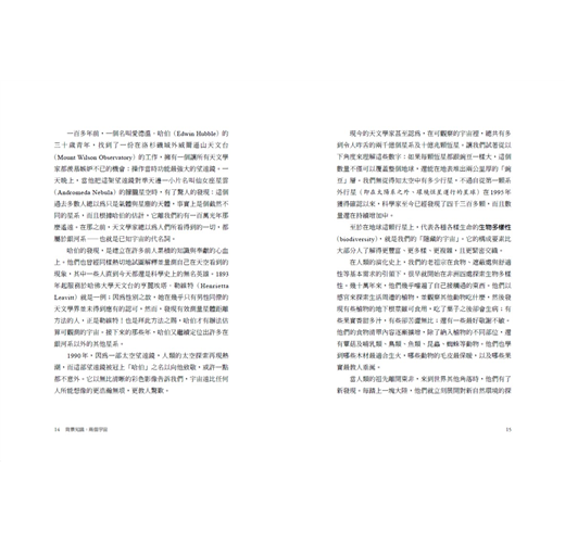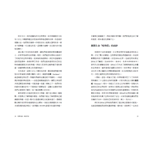 儘管身為研究者、教授者、管理者與學術領導者多年,這些經歷也讓我有充分的機會、深深浸淫在生物多樣性的世界中,然而今天的我,還是一如既往地對自然界充滿好奇與驚歎,也從未停止提出那些最根本的問題。在本書中,我試著為你回答這些問題,而這也連帶解釋了建構這個星球上所有生命的要素。希望這能進一步激發你來分享我對這些寶貴的自然生命的熱情──這些神奇的生命,就是我們隱藏的宇宙。