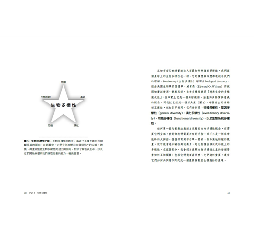 任何單一面向都無法表達出完整的生命多樣性概念,僅僅保育其中的單一要素,就可能會過分犧牲其他要素。本書深入探討這顆生物多樣性之星的每個要素如何互相連結。