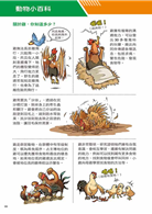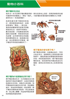 設有「動物小百科」單元,特別介紹陸寄居蟹科動物和原雞屬動物的構造與小常識,以及能捕食其他小型同類的短掌陸寄居蟹、會排隊和同伴交換螺殼的西里伯斯陸寄居蟹、身體顏色會跟著食物改變的灰白陸寄居蟹、會發出獨特的警報叫聲通知同伴有危險的原雞、擁有特殊羽毛圖案因而常被人們用來製作飛蠅釣假餌的灰原雞、雄性的雞冠中央呈超酷冰藍色的綠原雞等動物的超炫常識,讓小朋友有系統的學習。