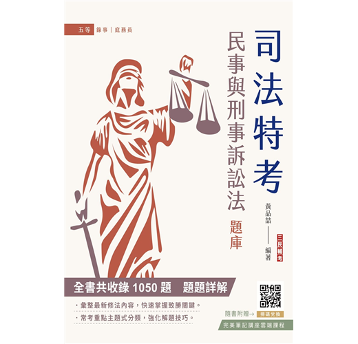 那您絕不能錯過三民輔考熱銷多年,由法科大師黃品喆所參與編輯的《民事與刑事訴訟法大意題庫》。本書三大特色: