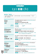 → purse – burs:purse本指皮革製的囊袋,其語音上對應到的字根burs也有相同概念,所以便可衍生出bursa、bursar、reimburse等字根相同的單字組合。