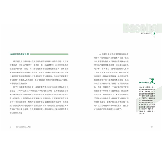 想了解球場的重要性,就要先從棒球場的歷史切入,讓大家透過棒球的起源、發展與歷史來了解整個臺灣棒球場的發展,並特別介紹臺北最重要、乘載許多棒球迷回憶的臺北市立棒球場,這座球場見證了臺灣棒球歷史許許多多重要的大事件。
